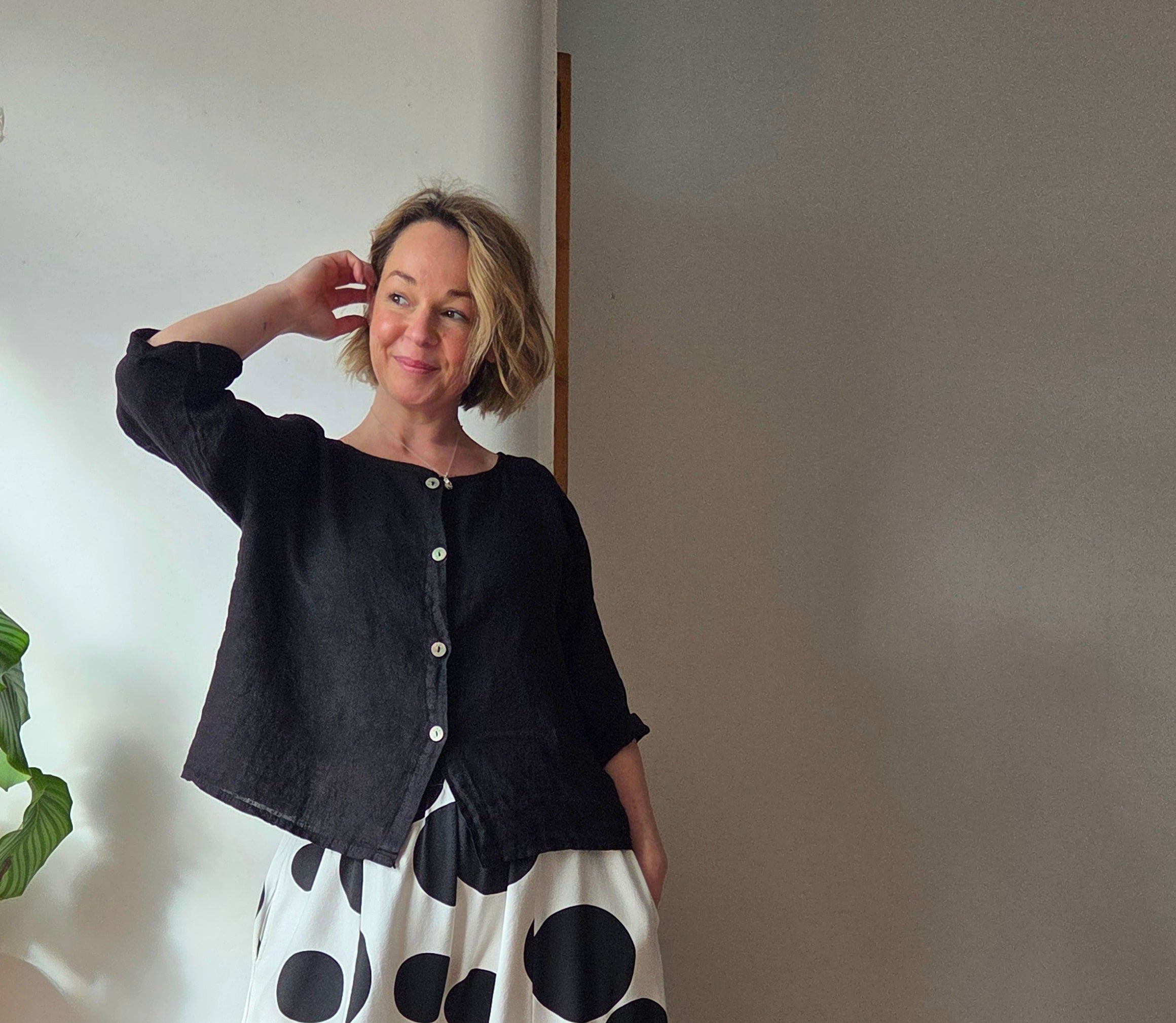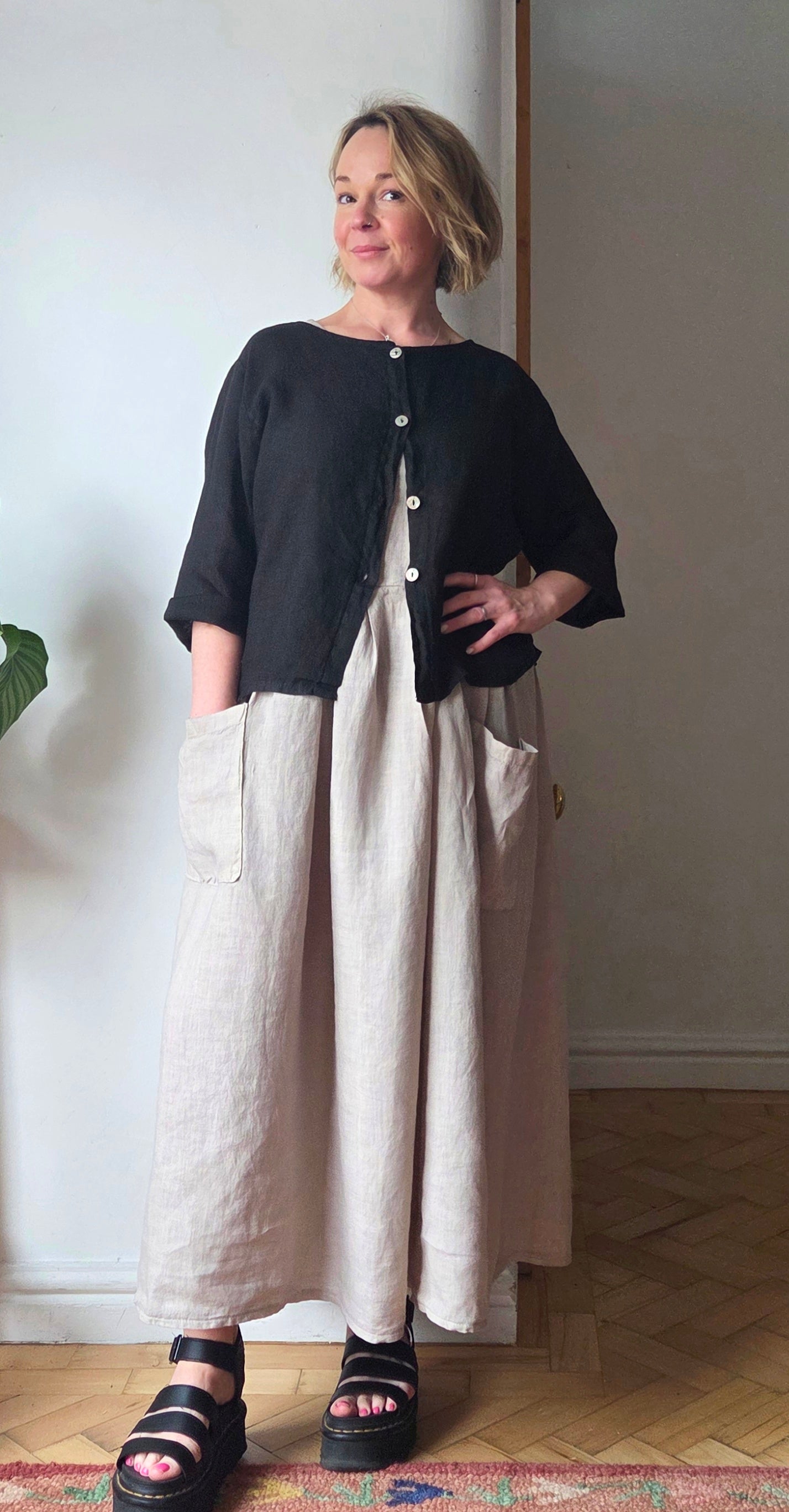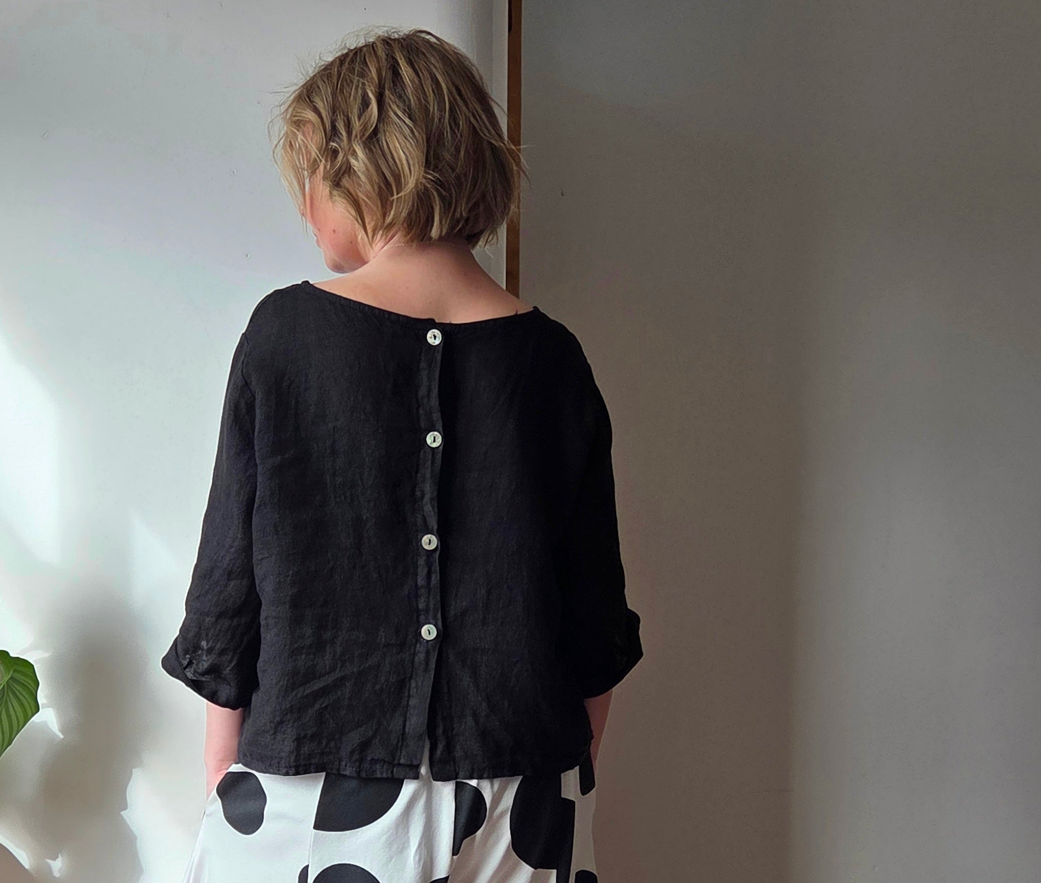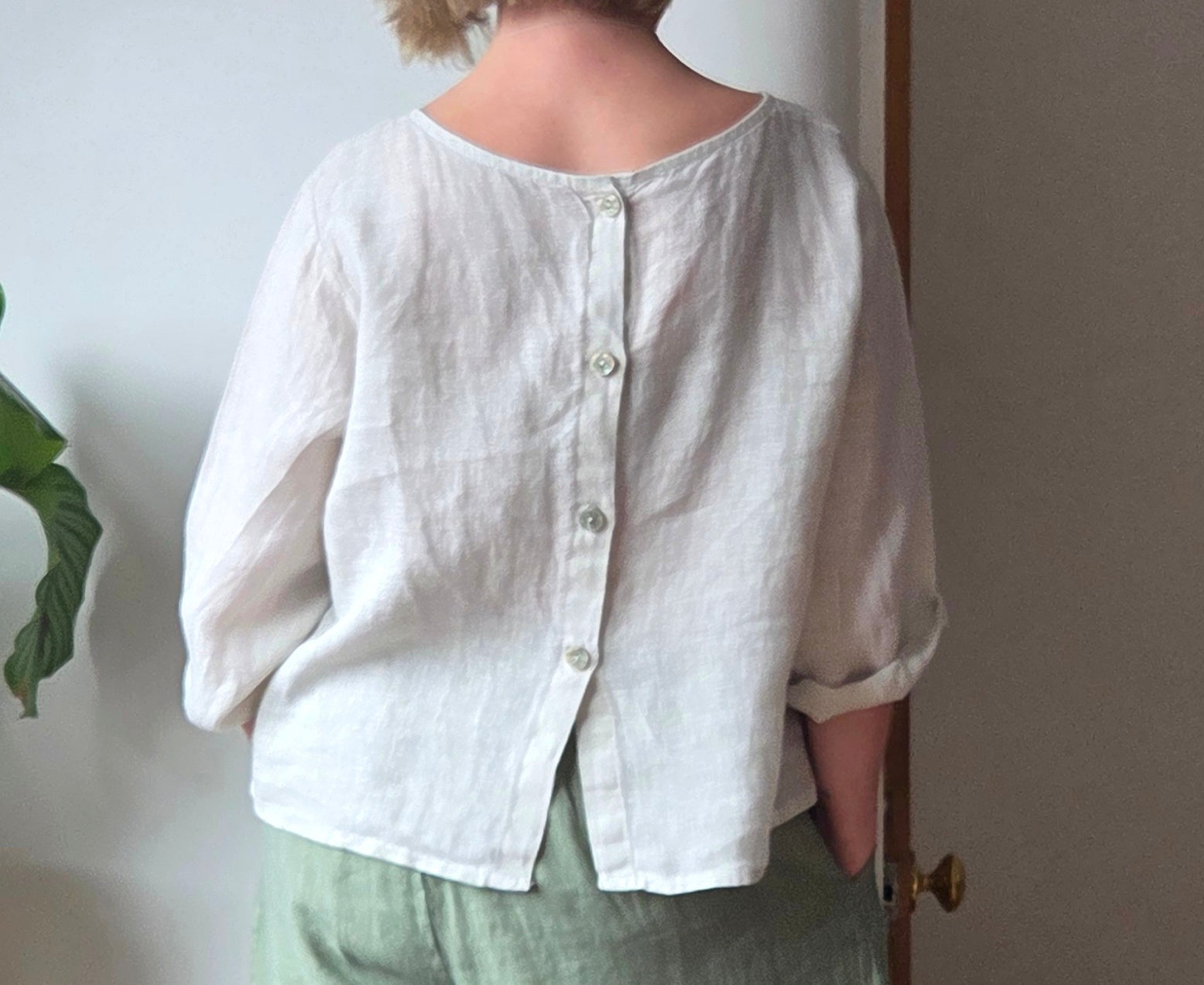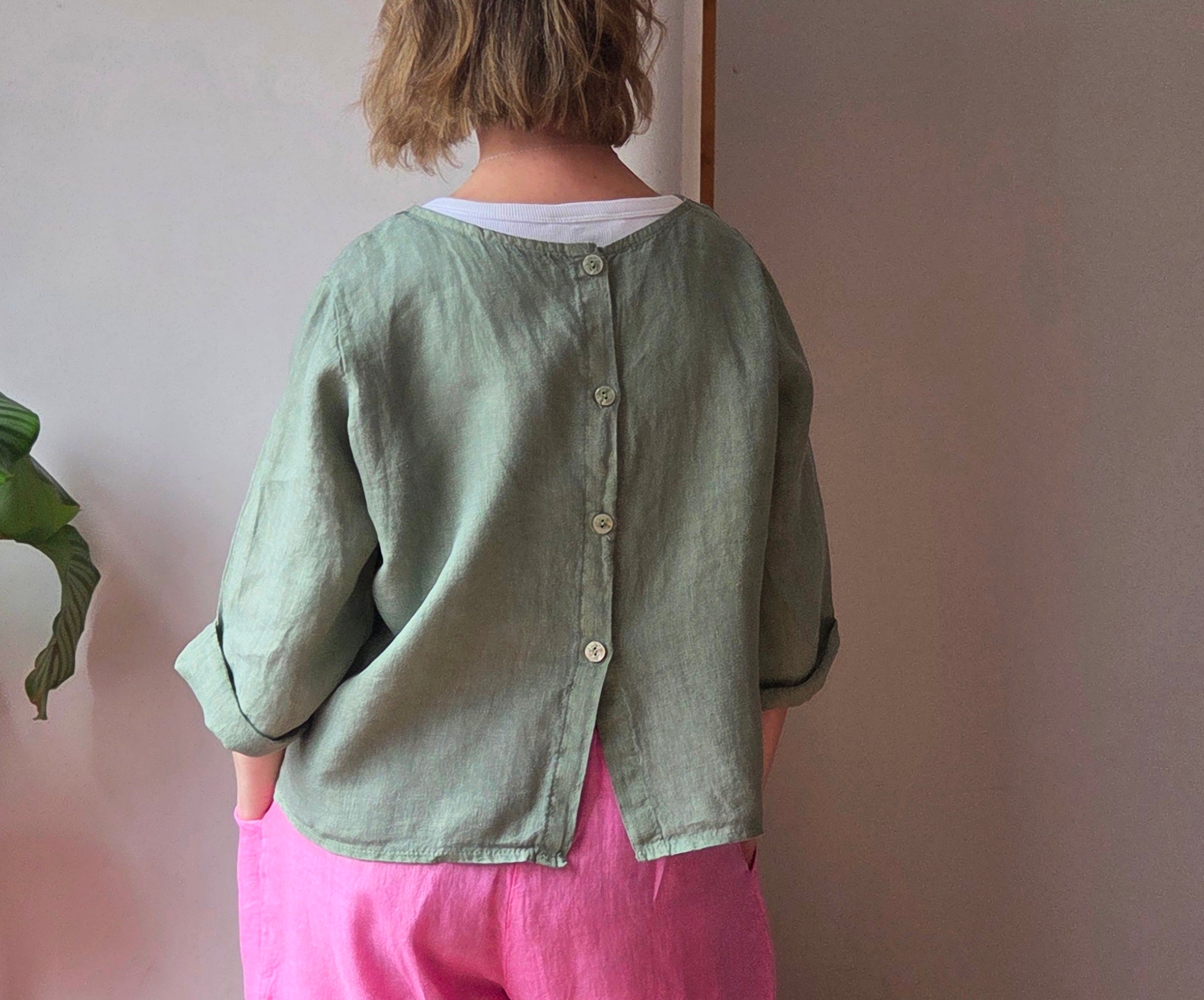 The Buttoned Linen top Is so versatile, it can be worn with the buttons open at the front as light layer over a dress or as top with the buttons adding detail to the back
