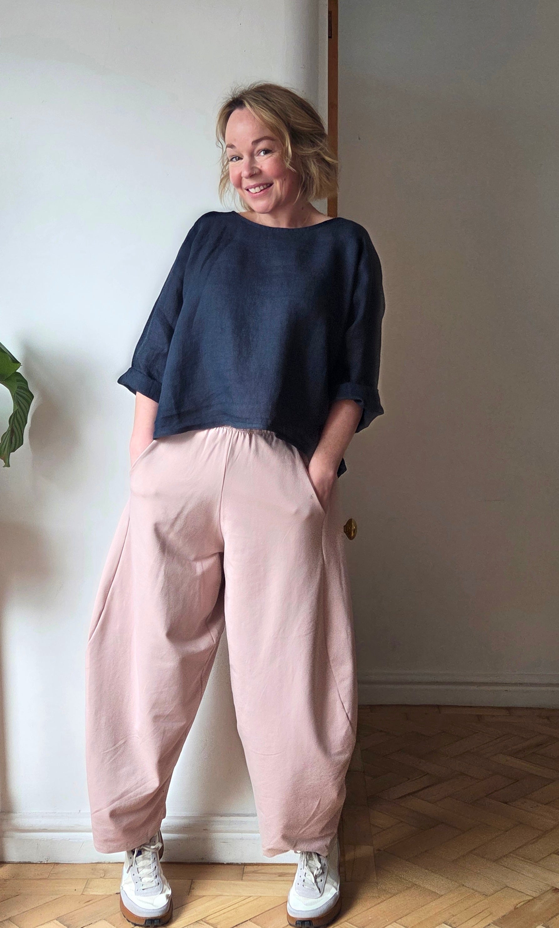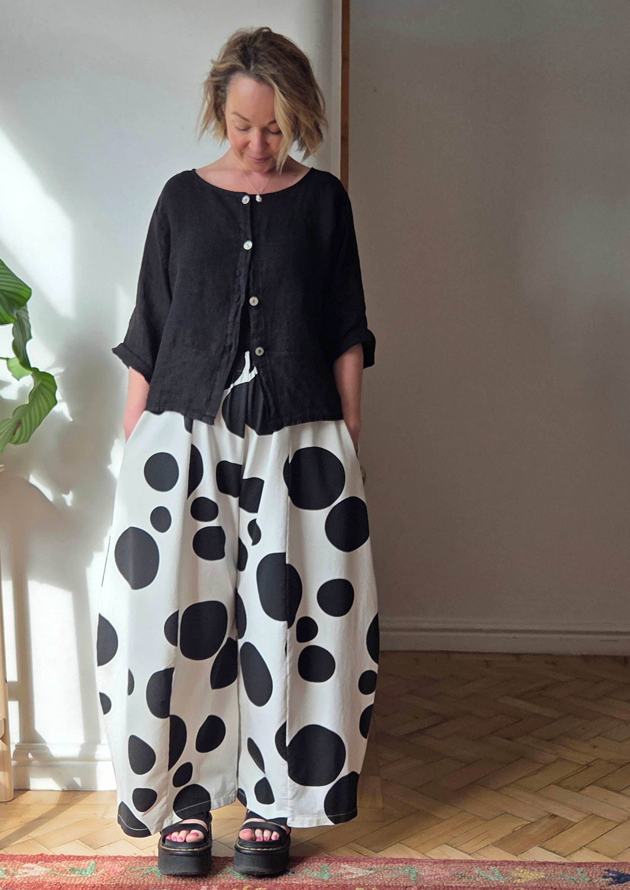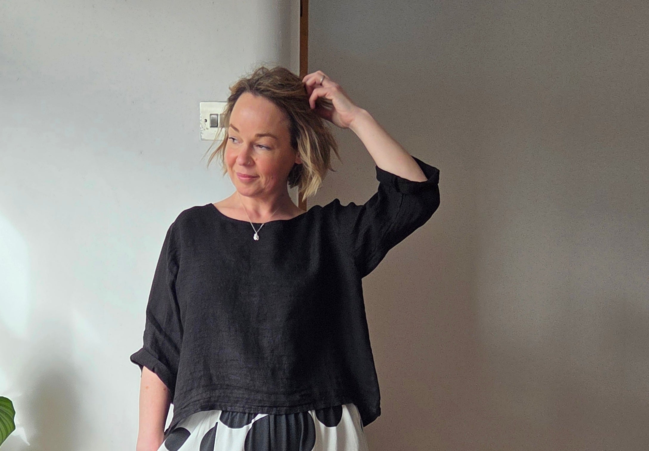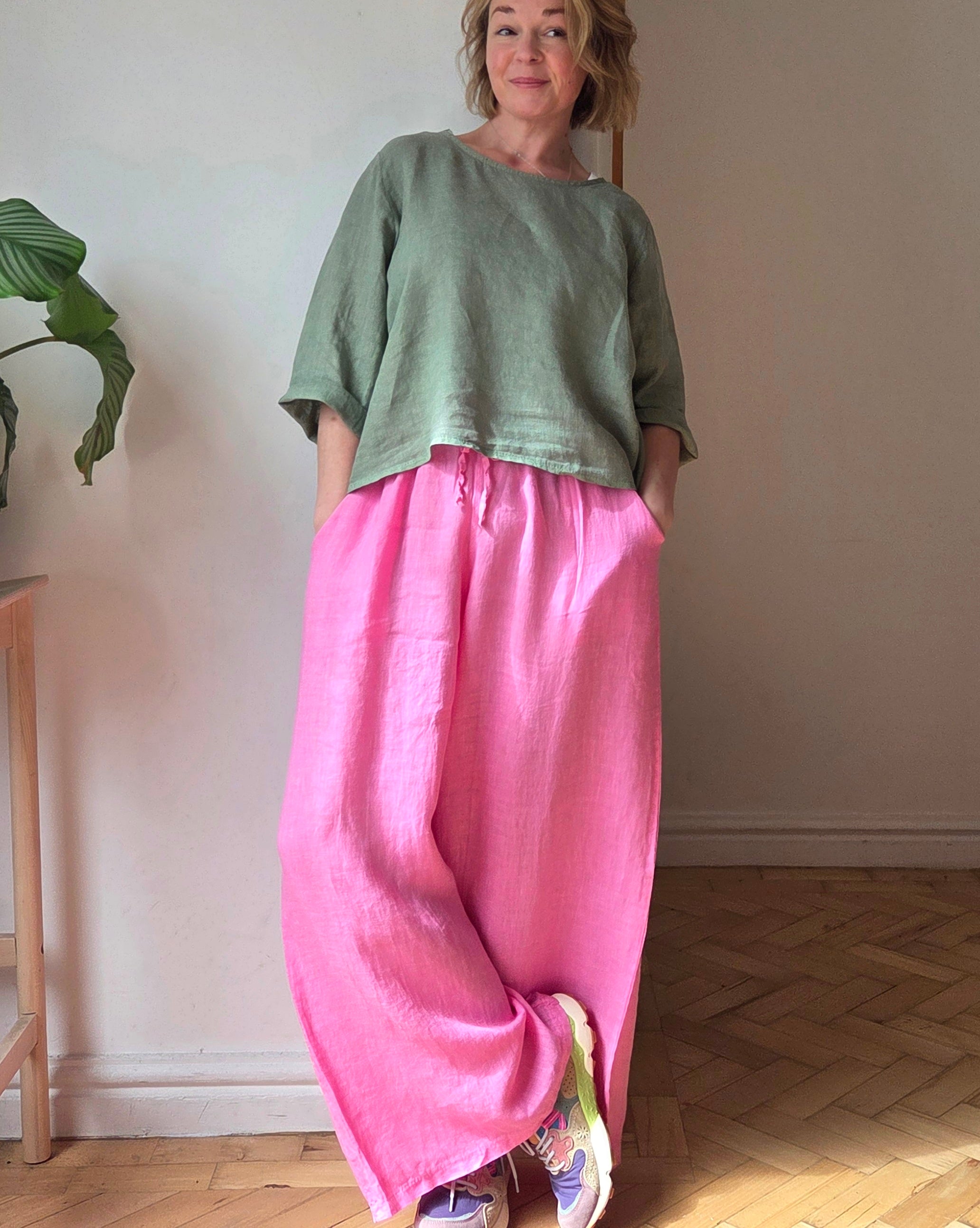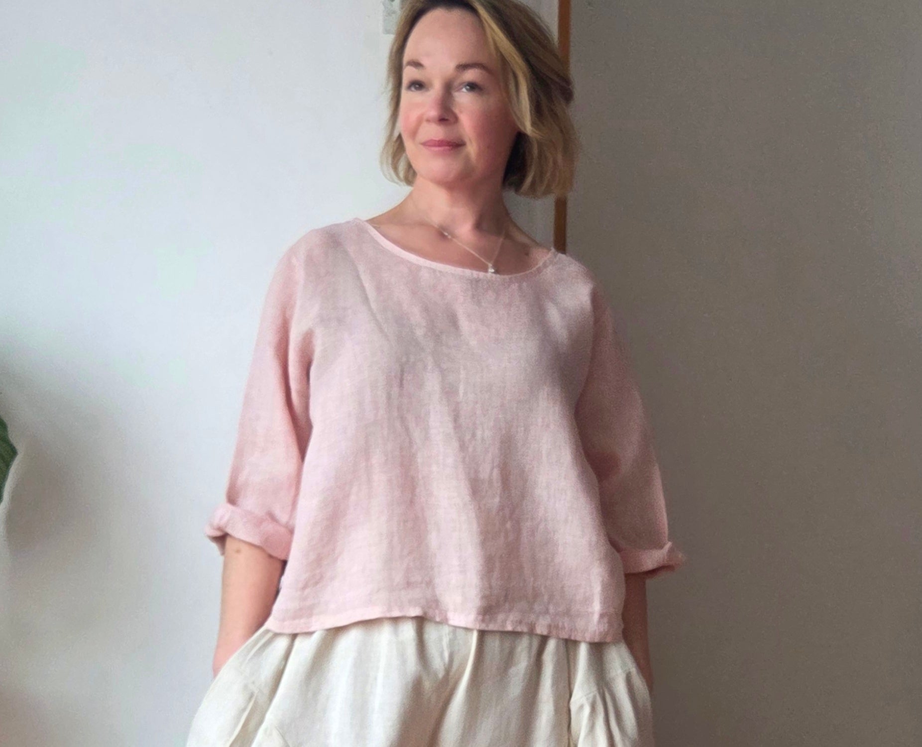 The Buttoned Linen top Is so versatile, it can be worn with the buttons open at the front as light layer over a dress or as top with the buttons adding detail to the back