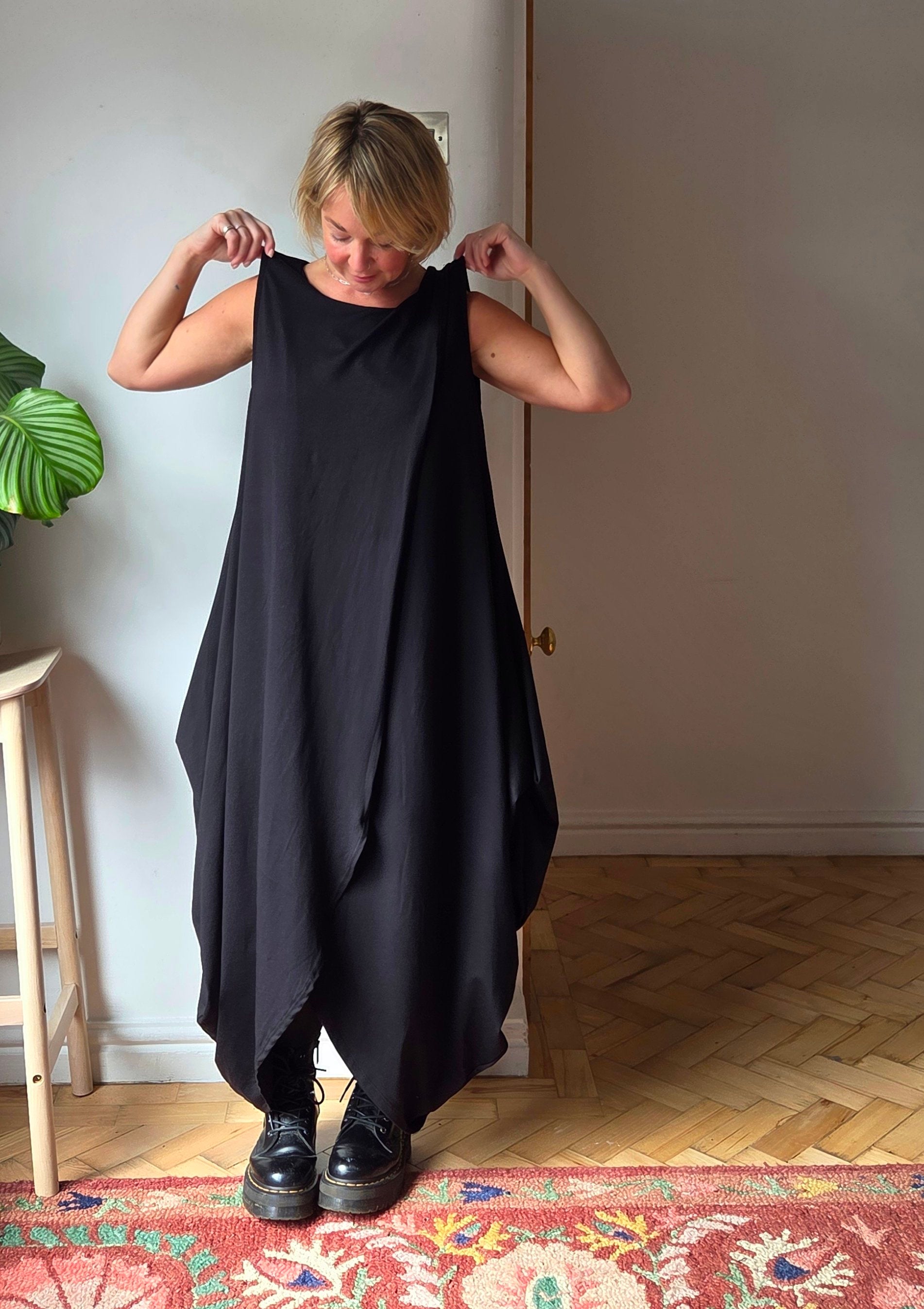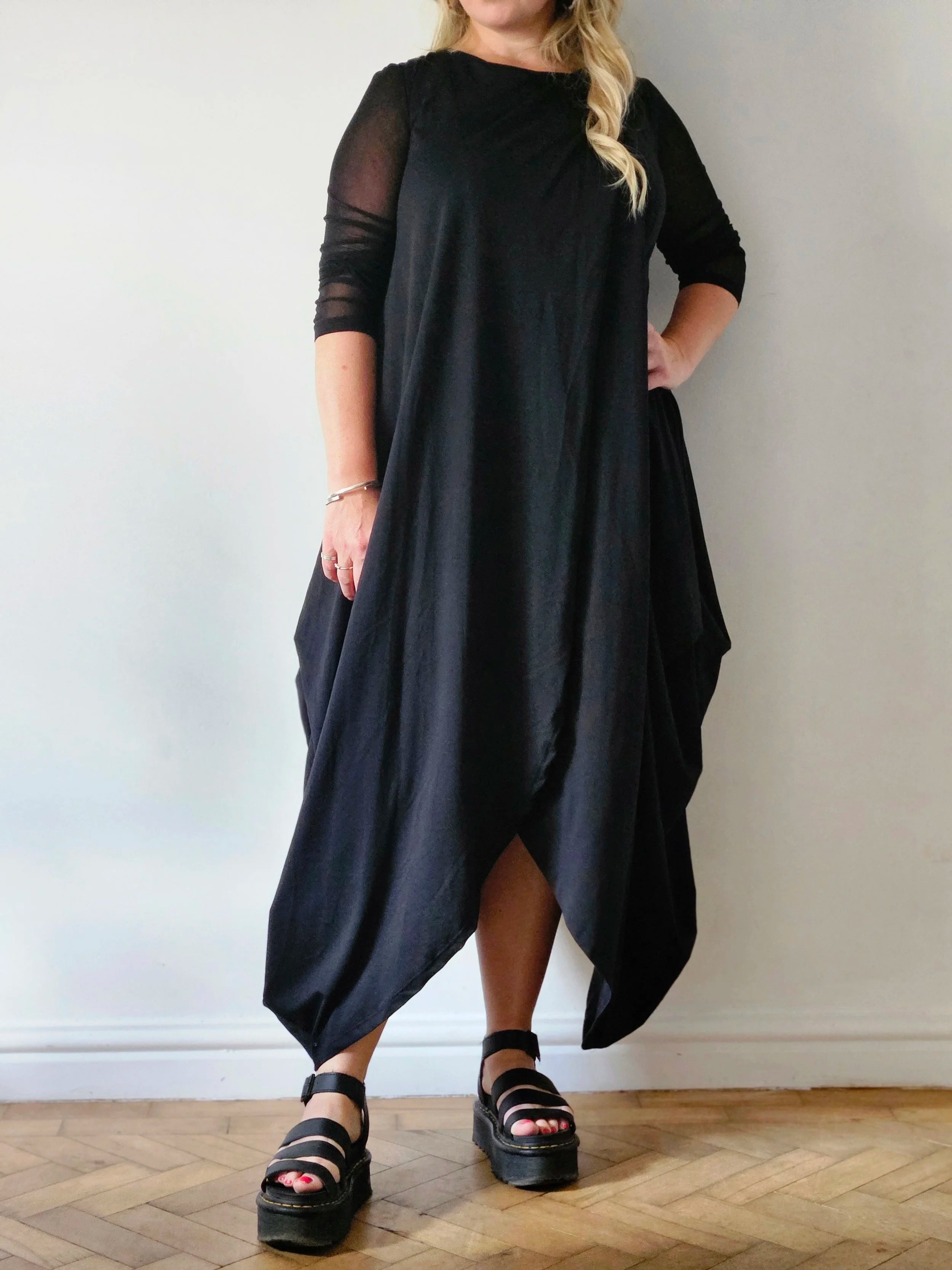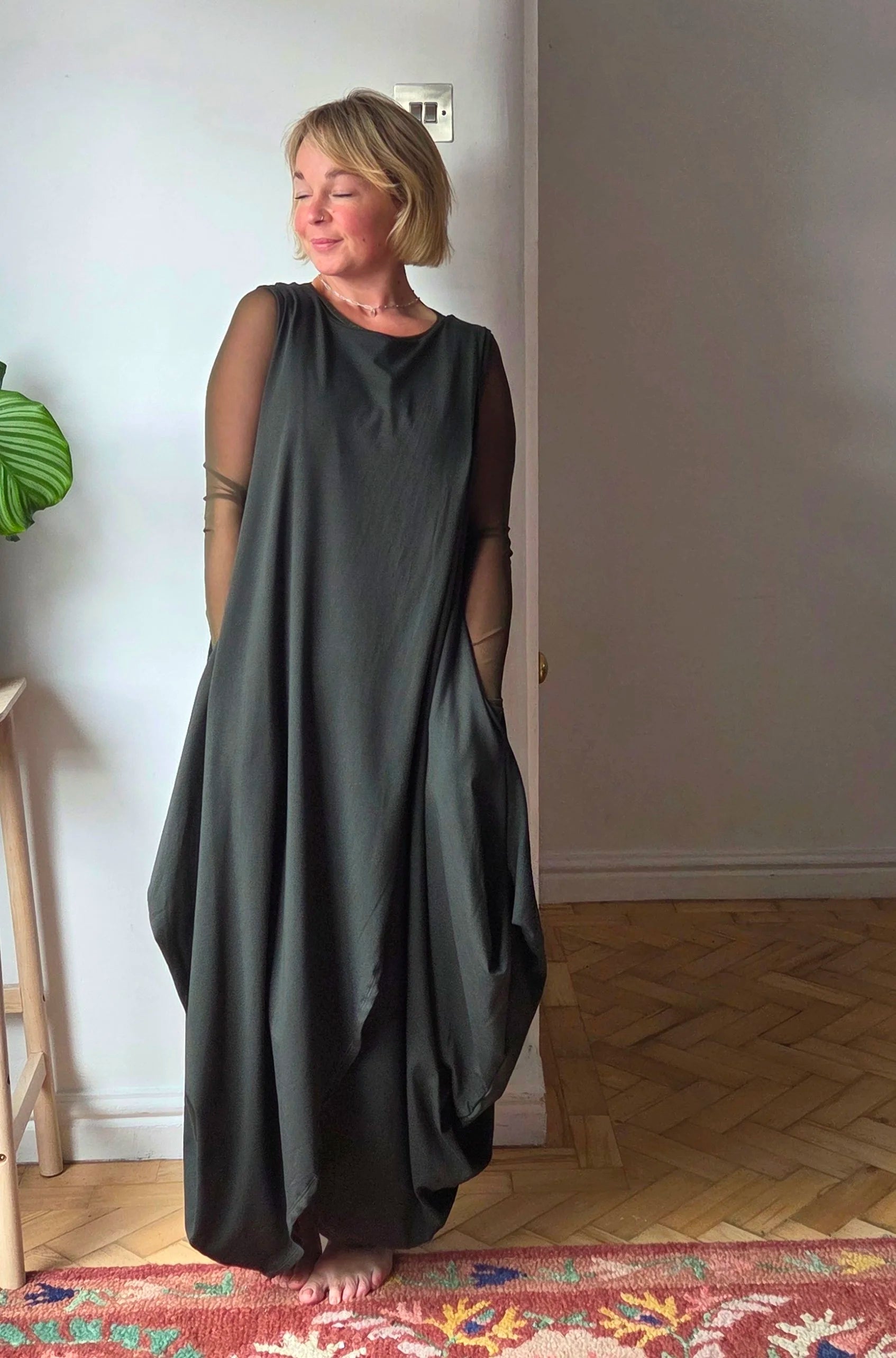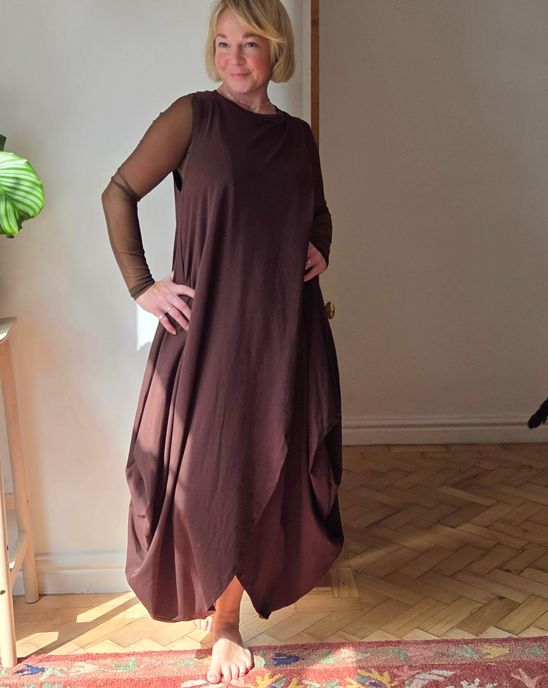 Wow! This Dress! It feels absolutely beautiful to wear, the. fabric is perfectly weighted to hang in the most flattering way. constructed of two pieces fabric this dress meets at the top creating a continuous split to the front and back. The cotton maxi dress is sleeveless but is shown in a few of the photos with a mesh top underneath giving it an “evening out” vibe, I really think it could take you anywhere. Also, it has pockets!!!