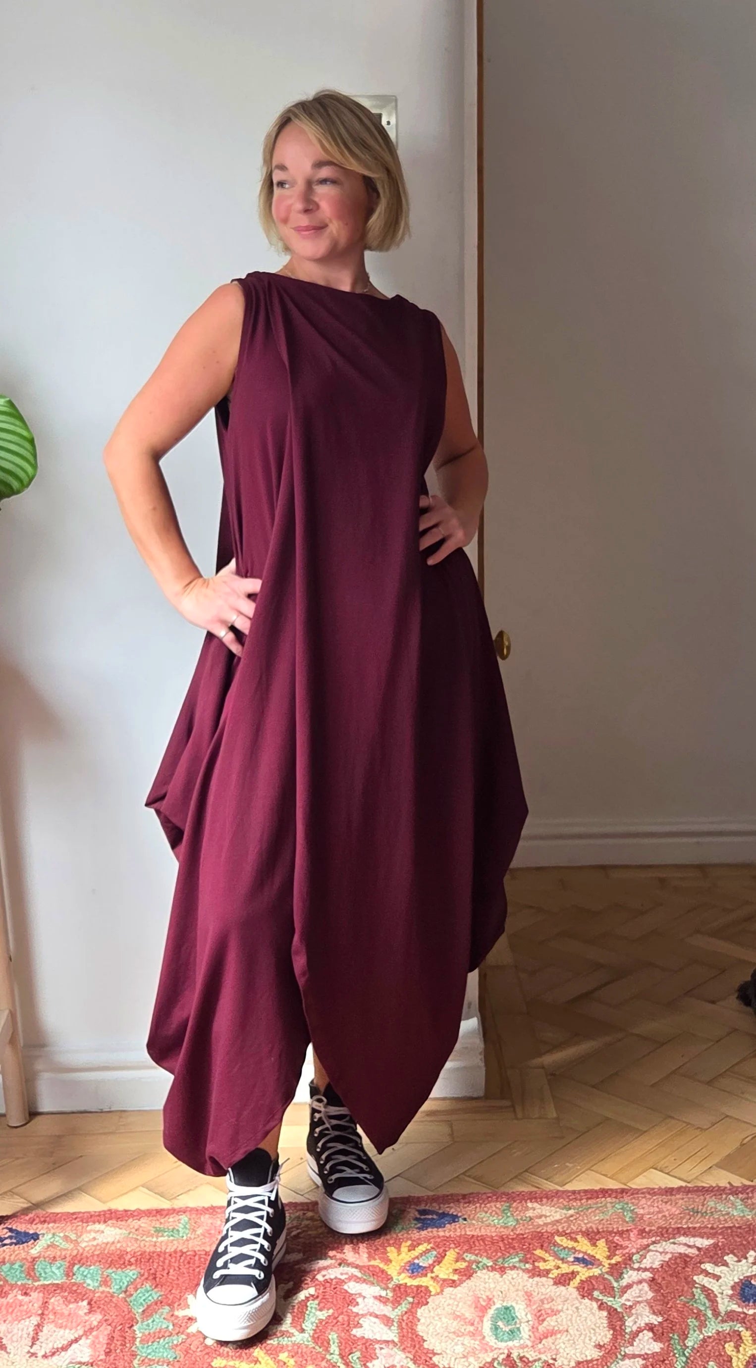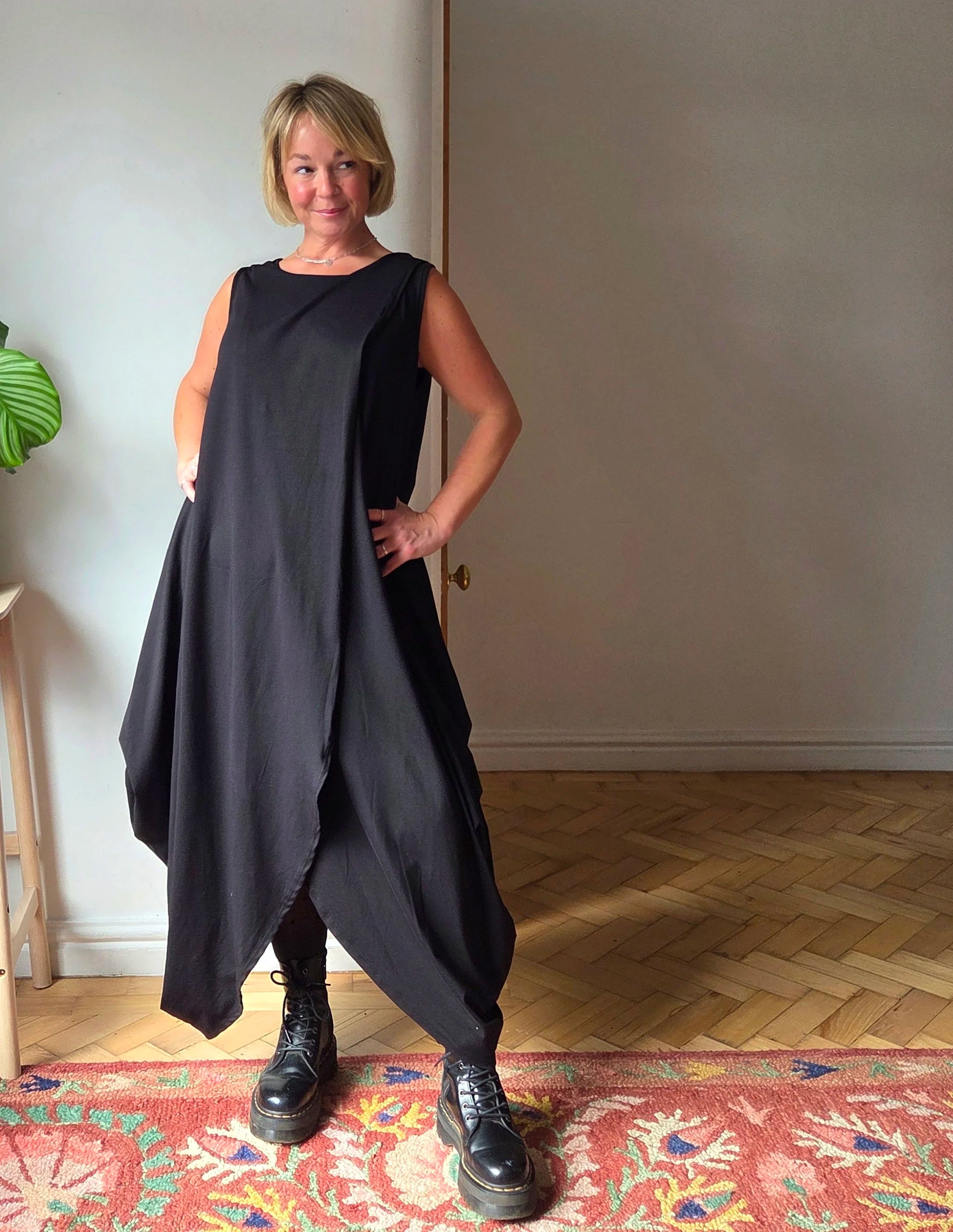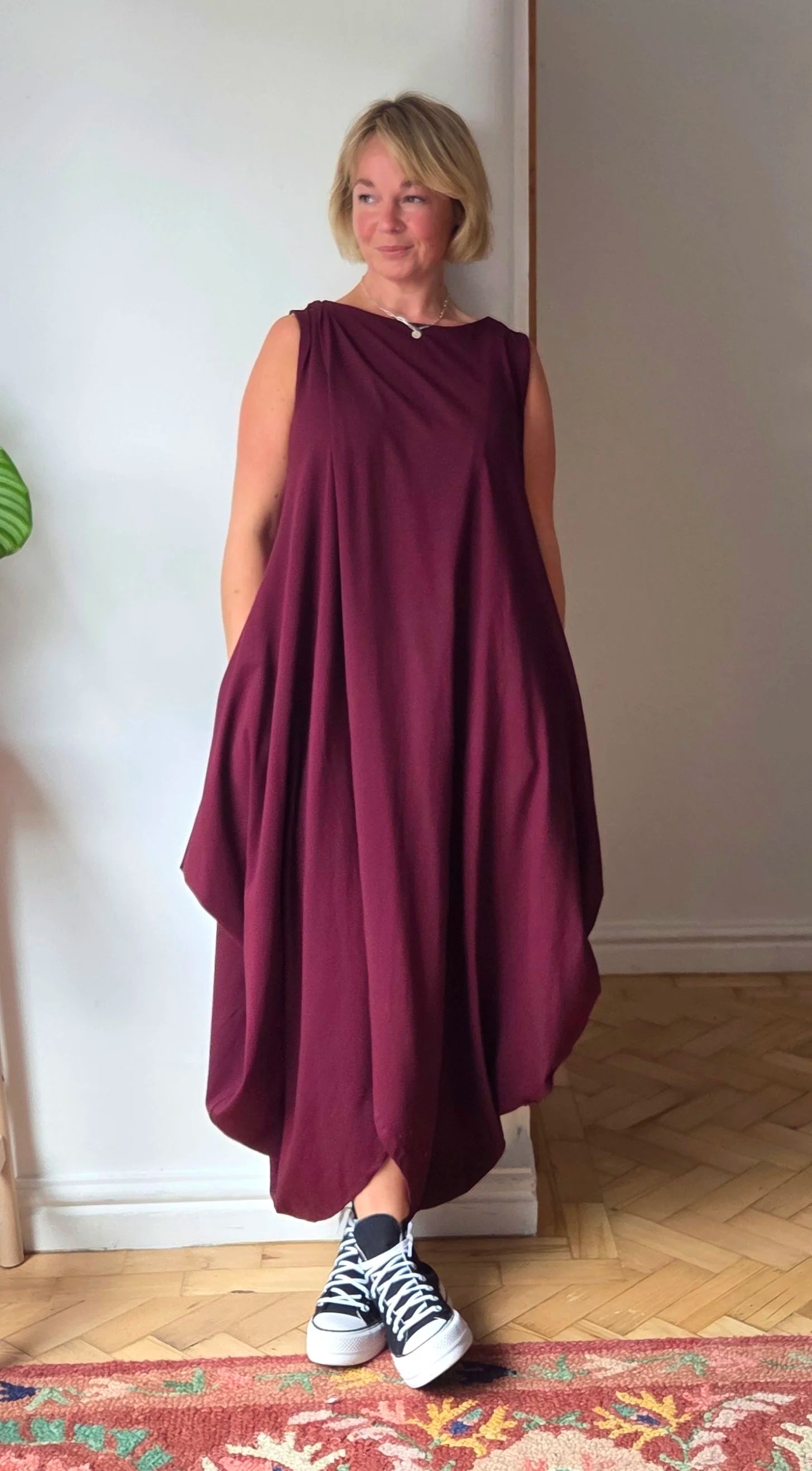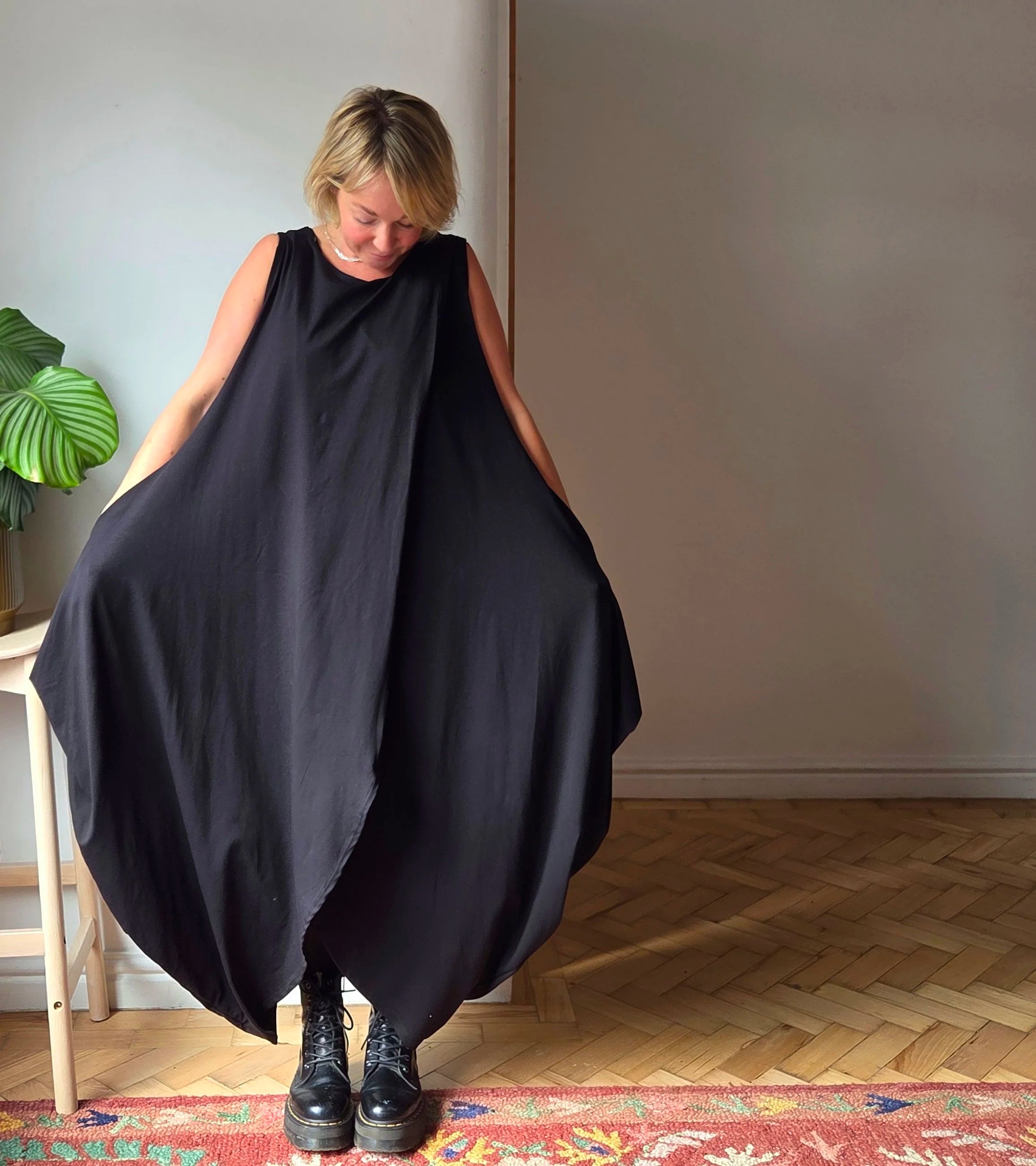 Wow! This Dress! It feels absolutely beautiful to wear, the. fabric is perfectly weighted to hang in the most flattering way. constructed of two pieces fabric this dress meets at the top creating a continuous split to the front and back. The cotton maxi dress is sleeveless but is shown in a few of the photos with a mesh top underneath giving it an “evening out” vibe, I really think it could take you anywhere. Also, it has pockets!!!