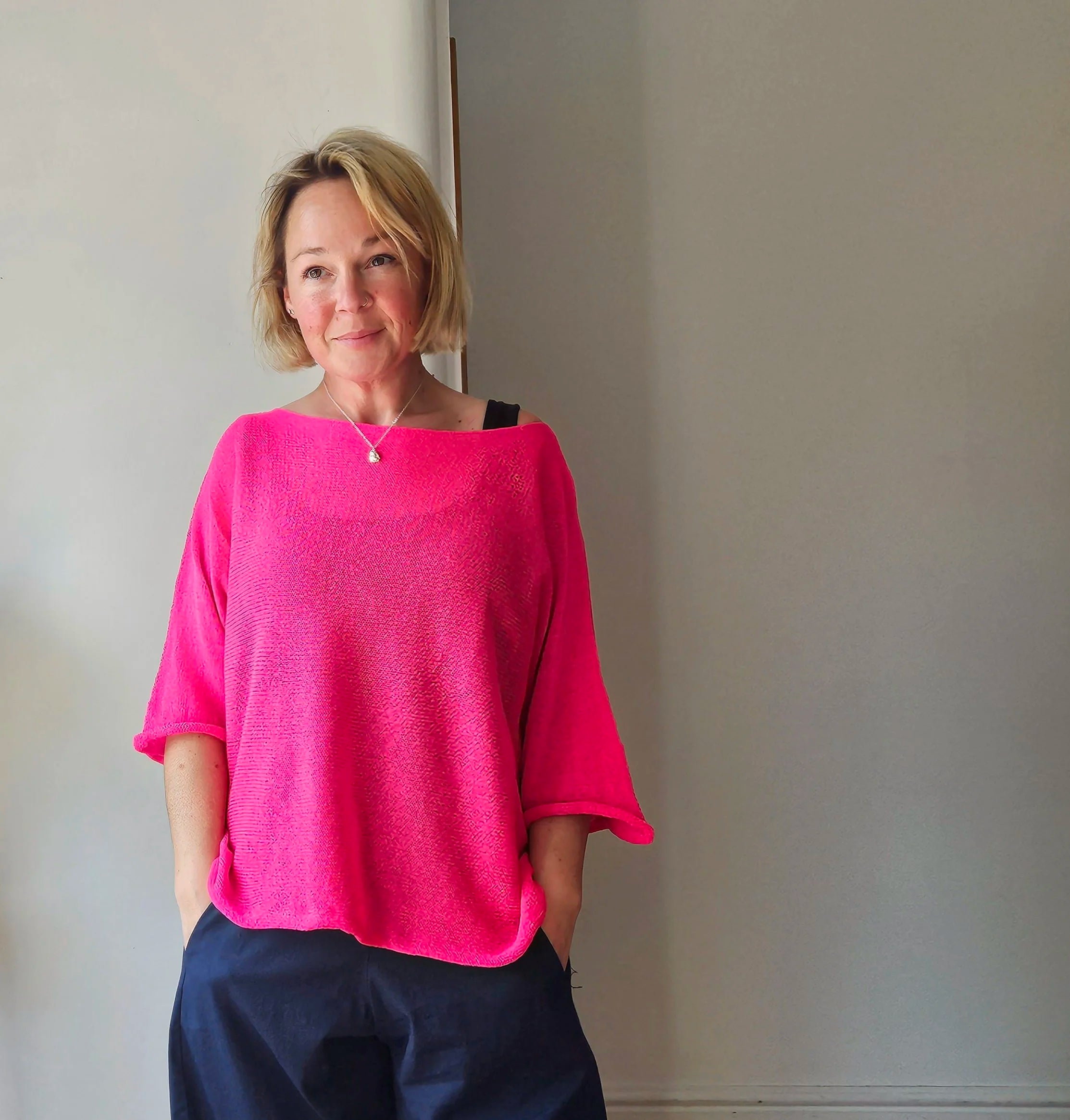 Fine knit top , straight cut knit.