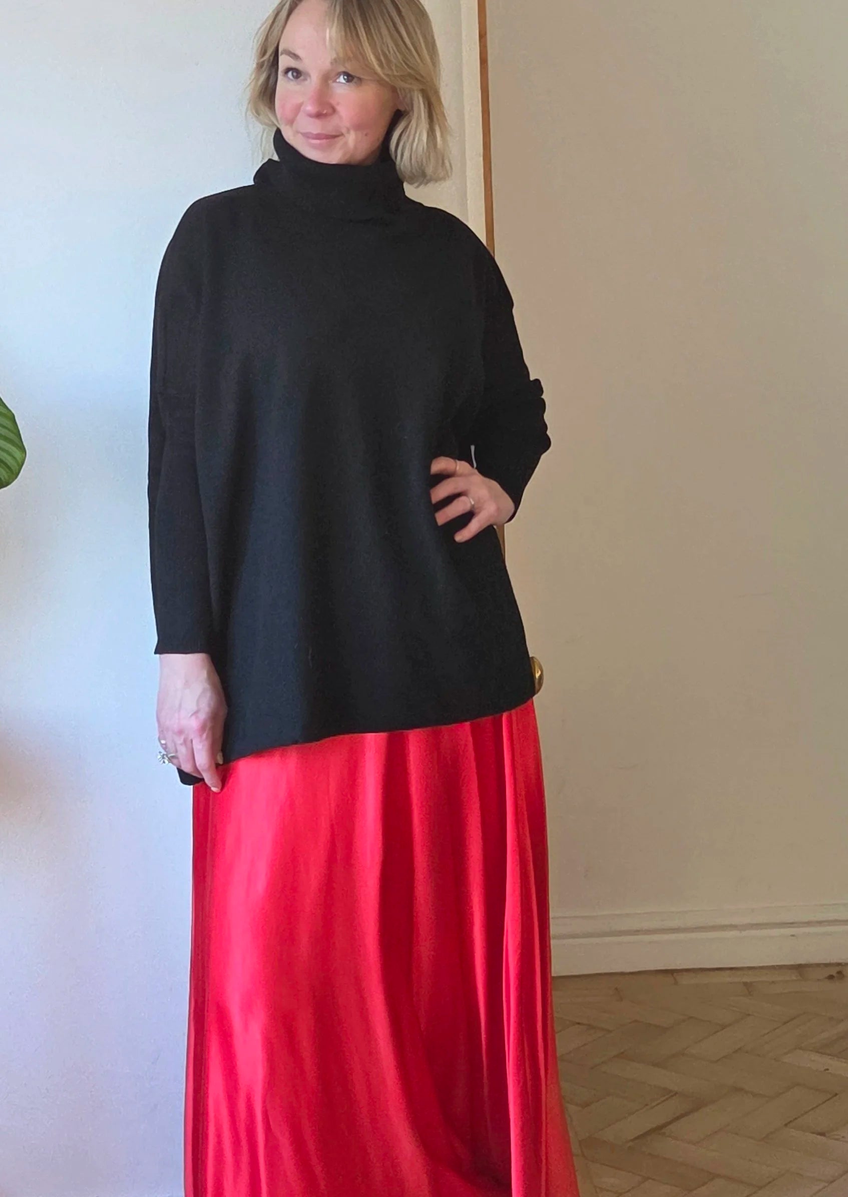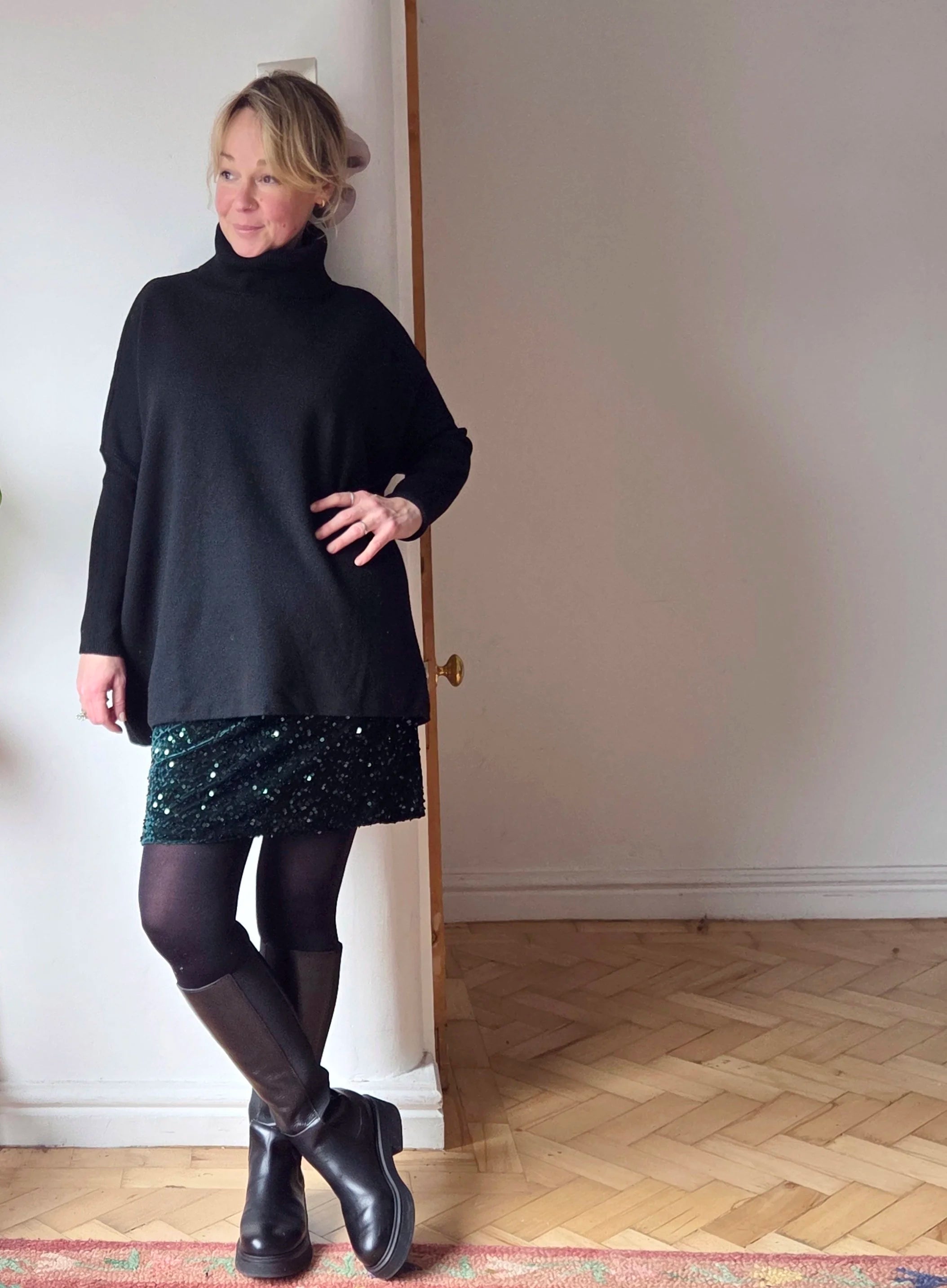 We love pairing this oversize roll neck jumper with a stunning sequin skirt for a party, or with our cropped barrel leg jeans for something more casual.