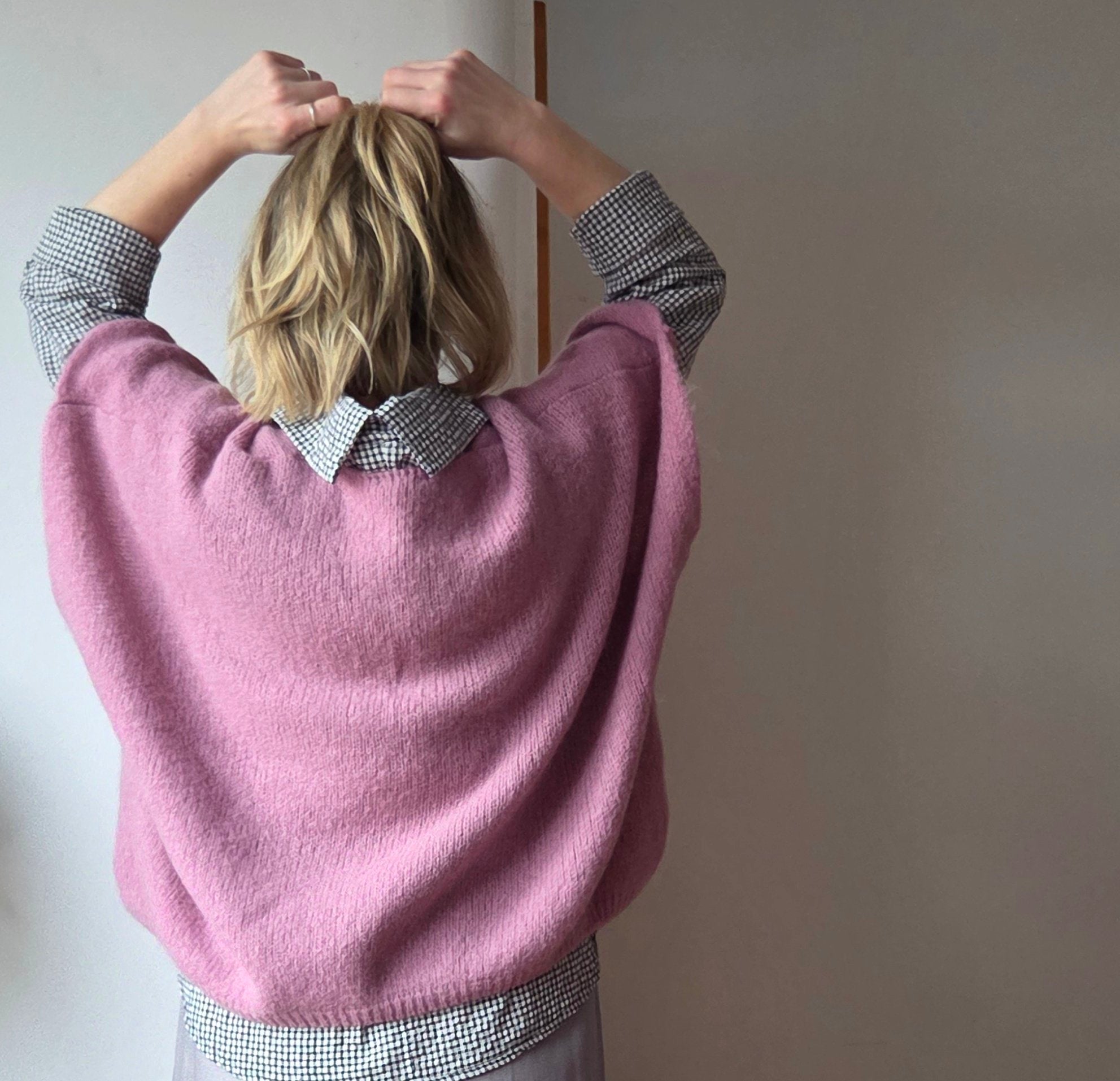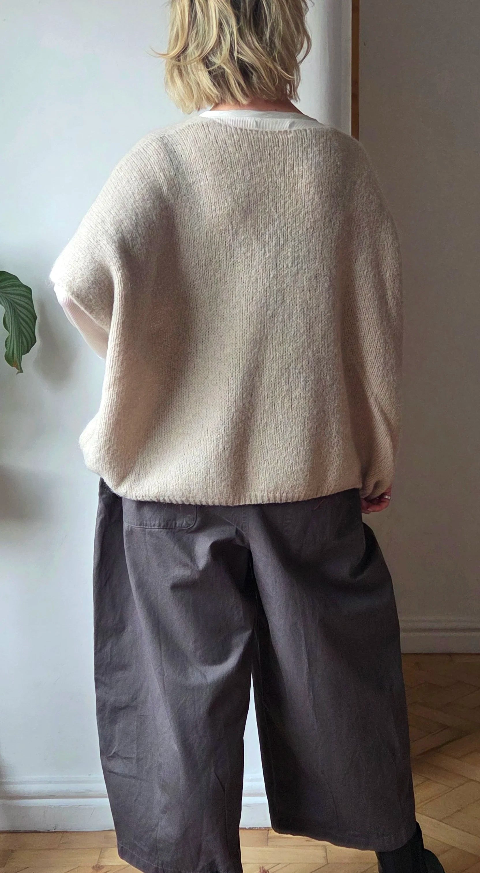 Lightweight oversized knitted vest top in a soft mohair-blend yarn. Relaxed, boxy silhouette with dropped shoulders for easy layering. Deep V-neckline frames the collarbone and pairs neatly with shirts or tees. Fine, airy knit offers a cloud-like drape and subtle halo for a refined, textural finish. Ribbed edges at neckline, armholes, and hem provide gentle structure while maintaining a soft look. Breathable and warm without bulk—ideal for transitional weather and layered outfits. Hand wash or gentle cycle recommended; reshape flat to dry. Available in neutral and seasonal hues. Designed for an intentionally roomy fit.