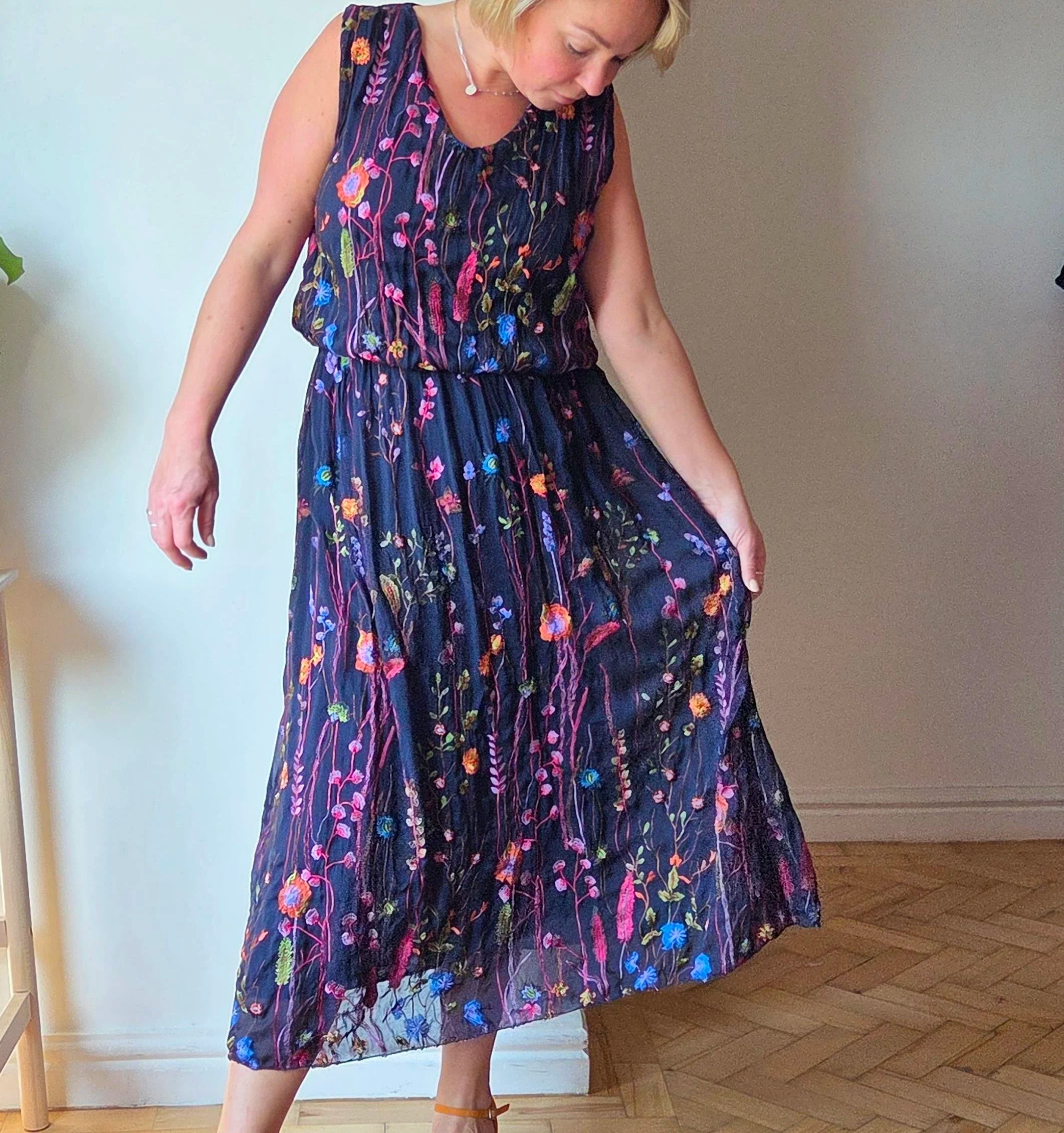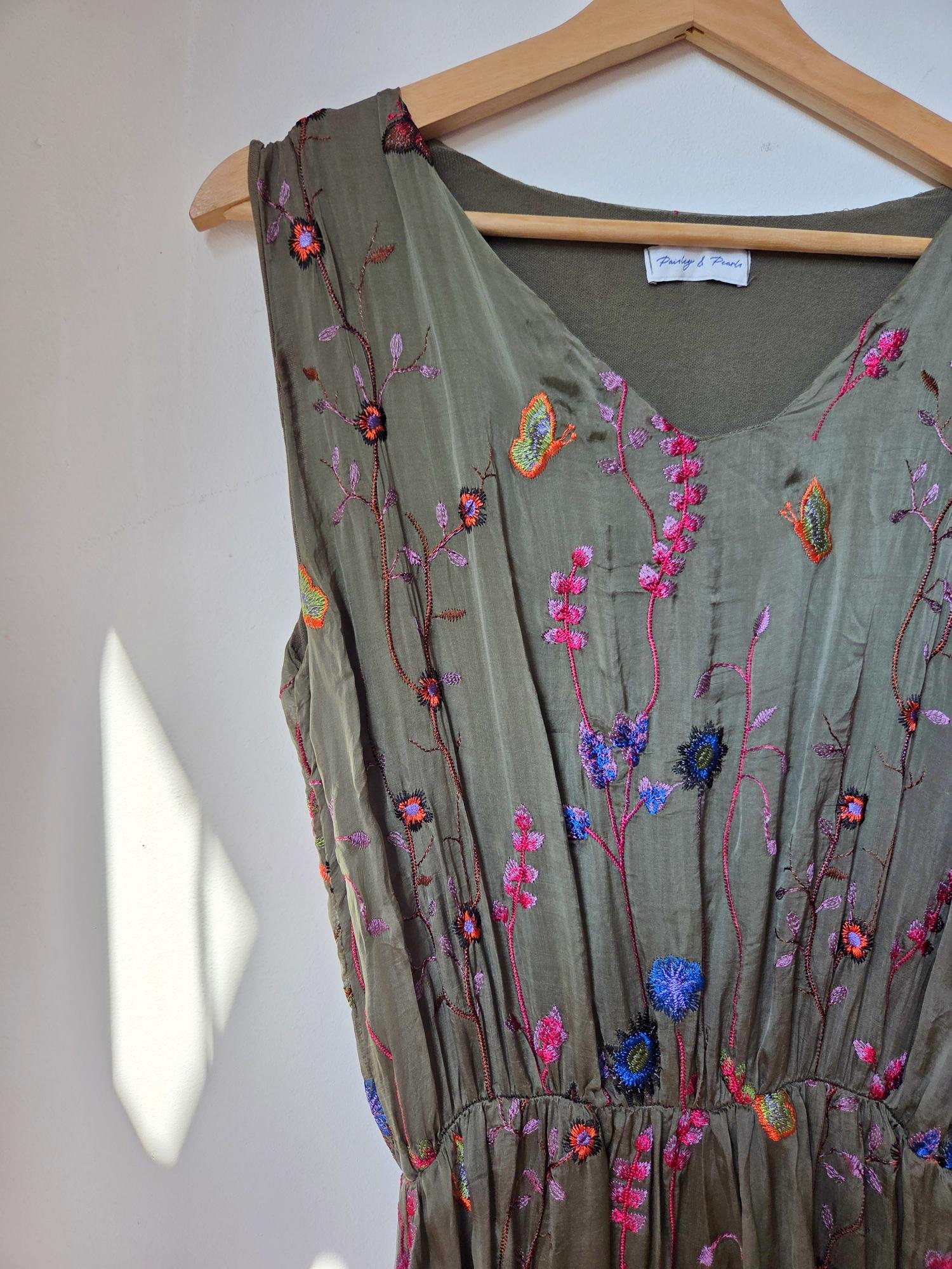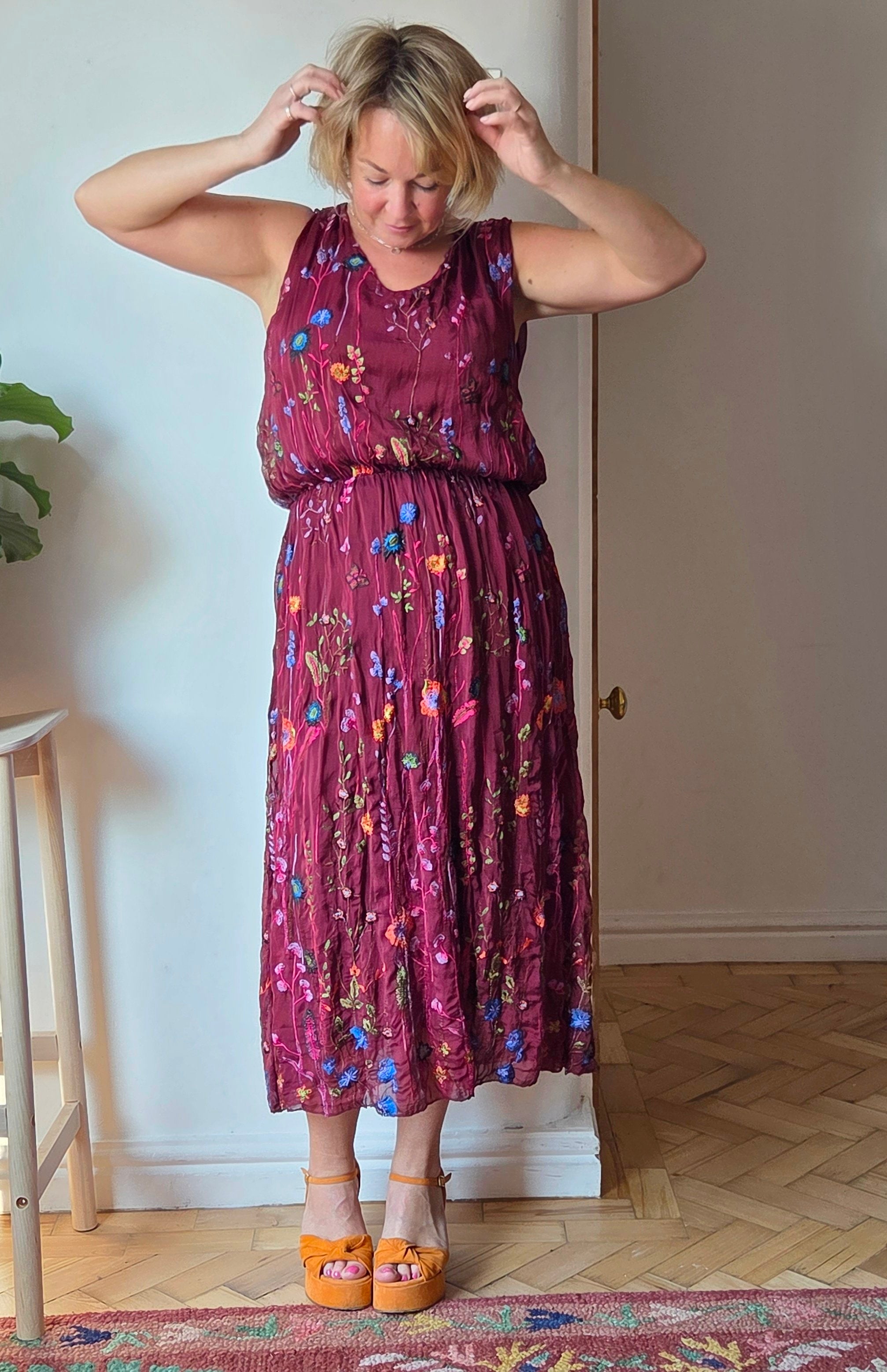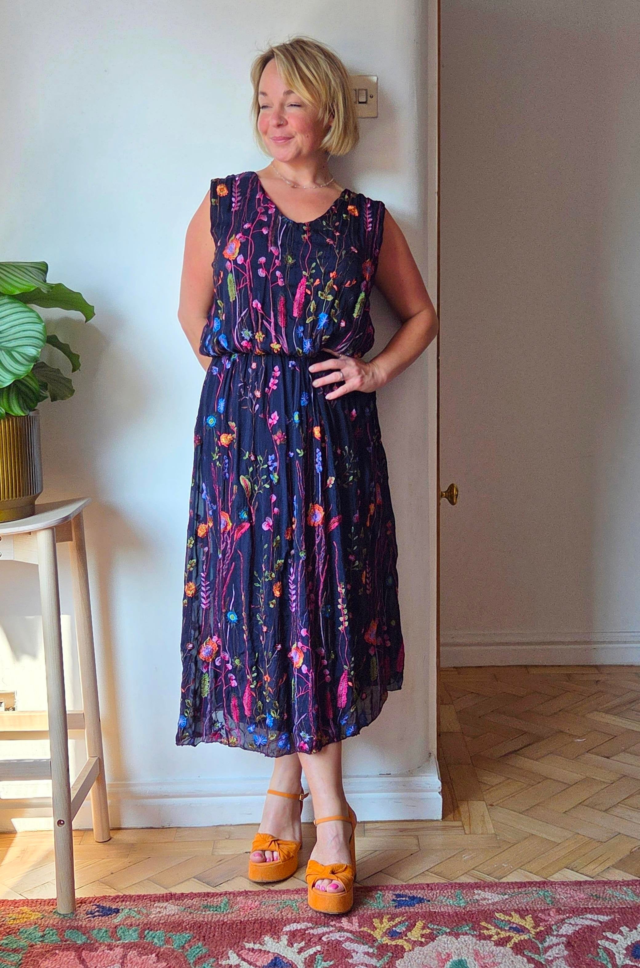 This wild flower silk blend dress features delicate embroidered wildflowers that add a touch of natural elegance. The elasticated waist detail gently cinches to hold the shape of the dress beautifully, flattering the silhouette without sacrificing comfort. Ideal for special occasions, it also pairs effortlessly with a balloon sleeve cardigan for cooler months, making it a versatile addition to your wardrobe year-round.