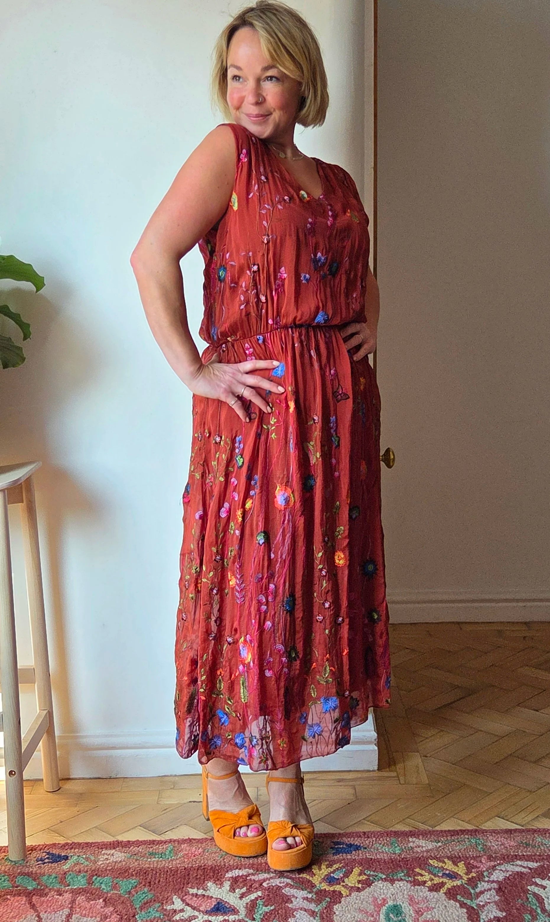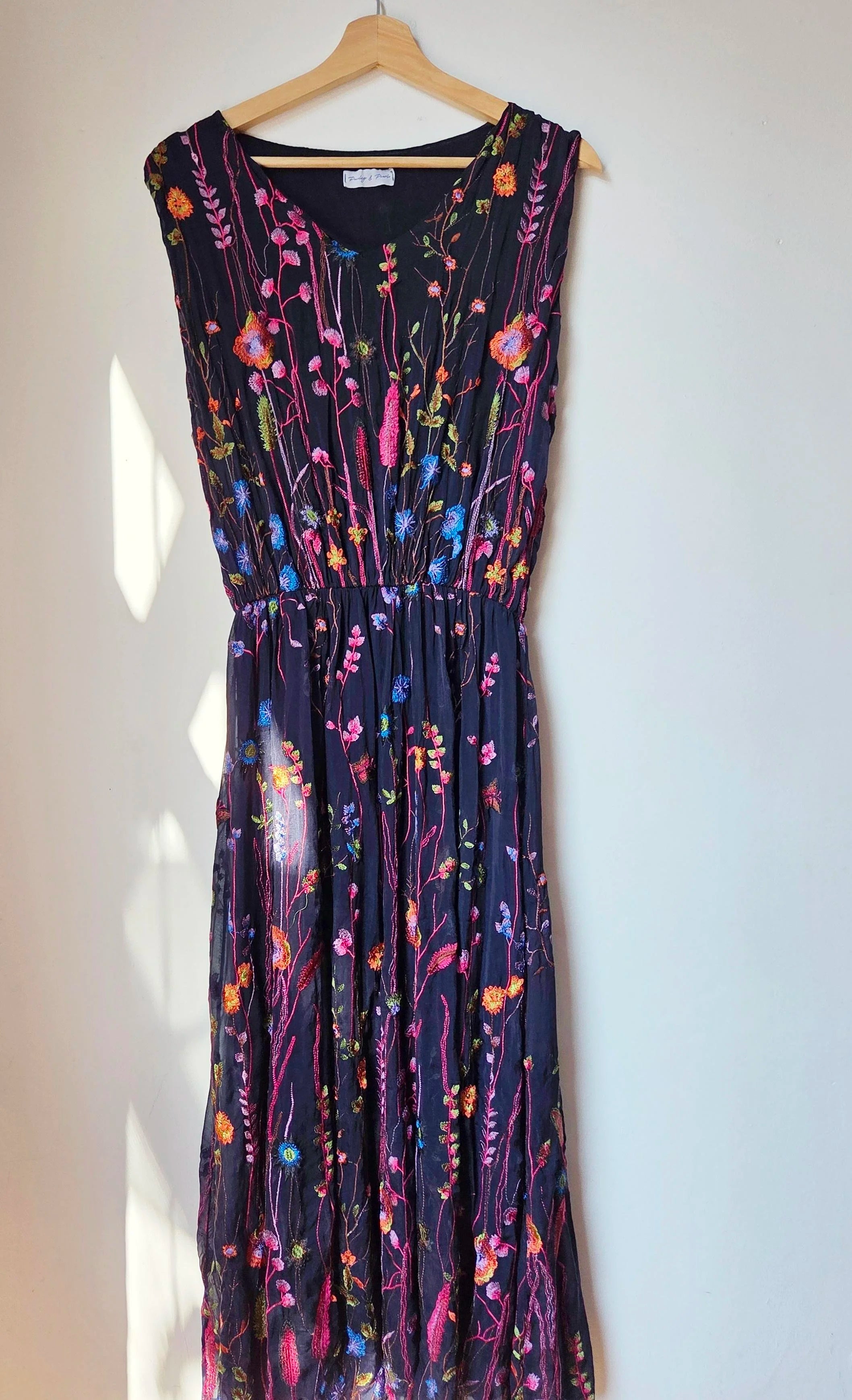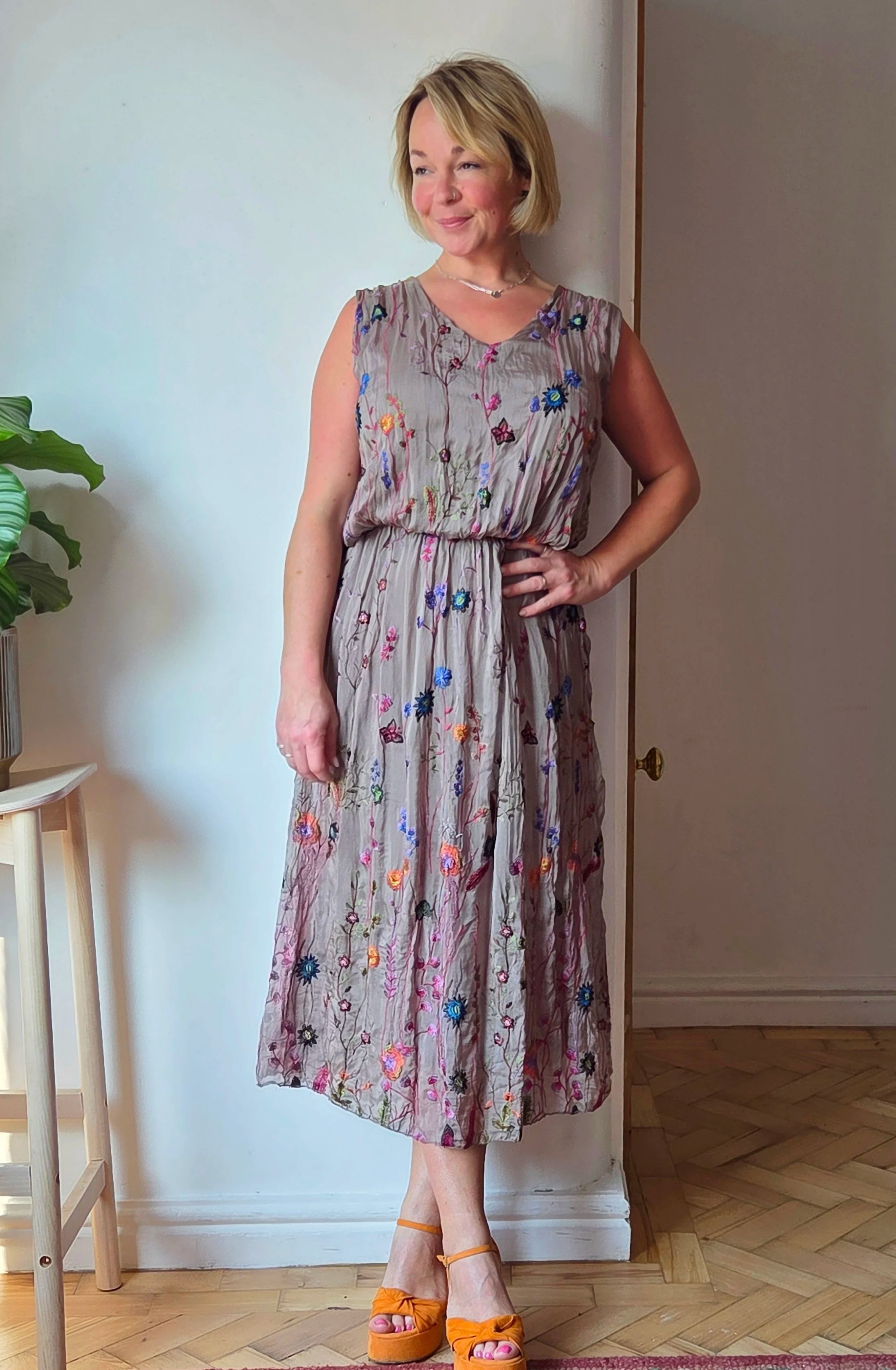 This wild flower silk blend dress features delicate embroidered wildflowers that add a touch of natural elegance. The elasticated waist detail gently cinches to hold the shape of the dress beautifully, flattering the silhouette without sacrificing comfort. Ideal for special occasions, it also pairs effortlessly with a balloon sleeve cardigan for cooler months, making it a versatile addition to your wardrobe year-round.