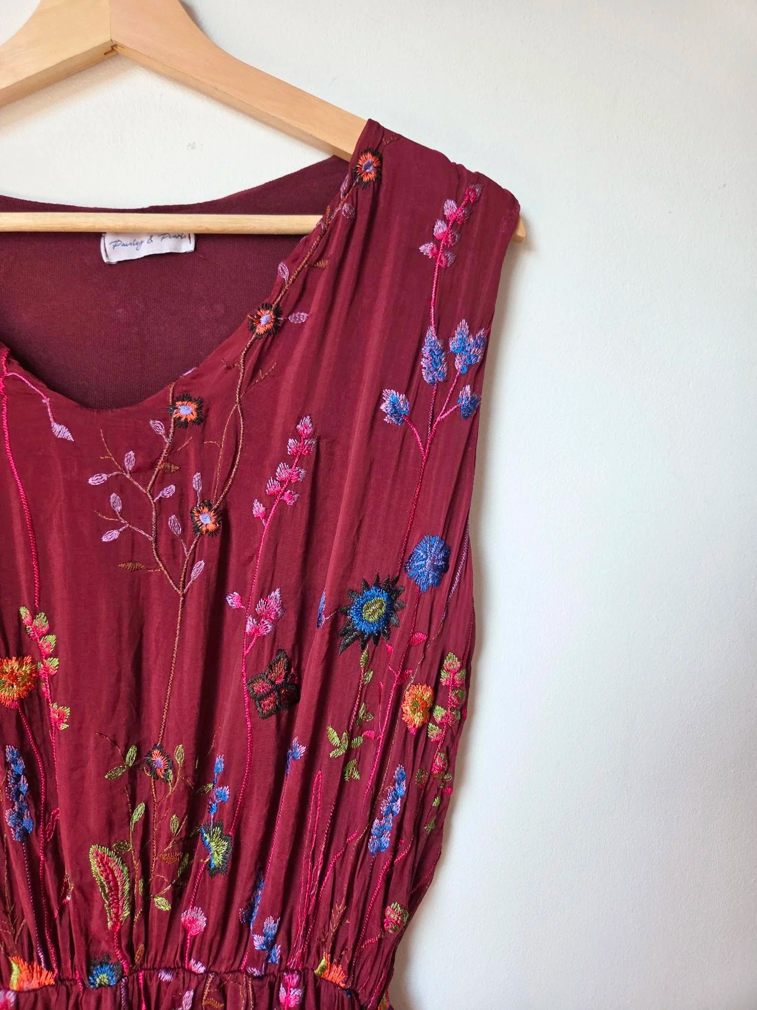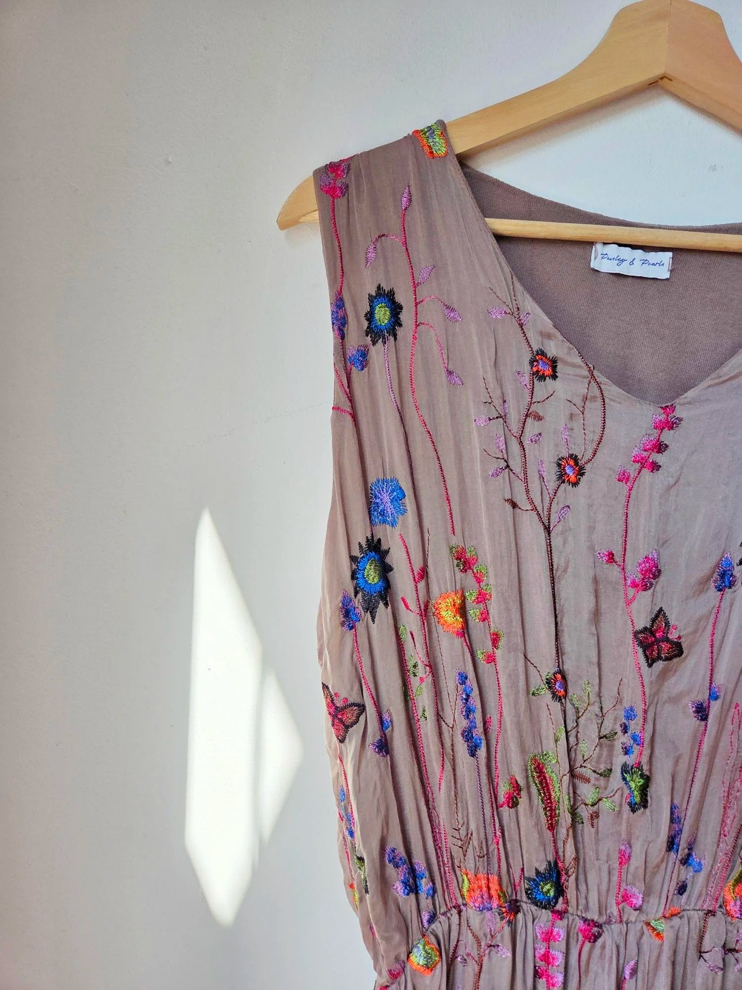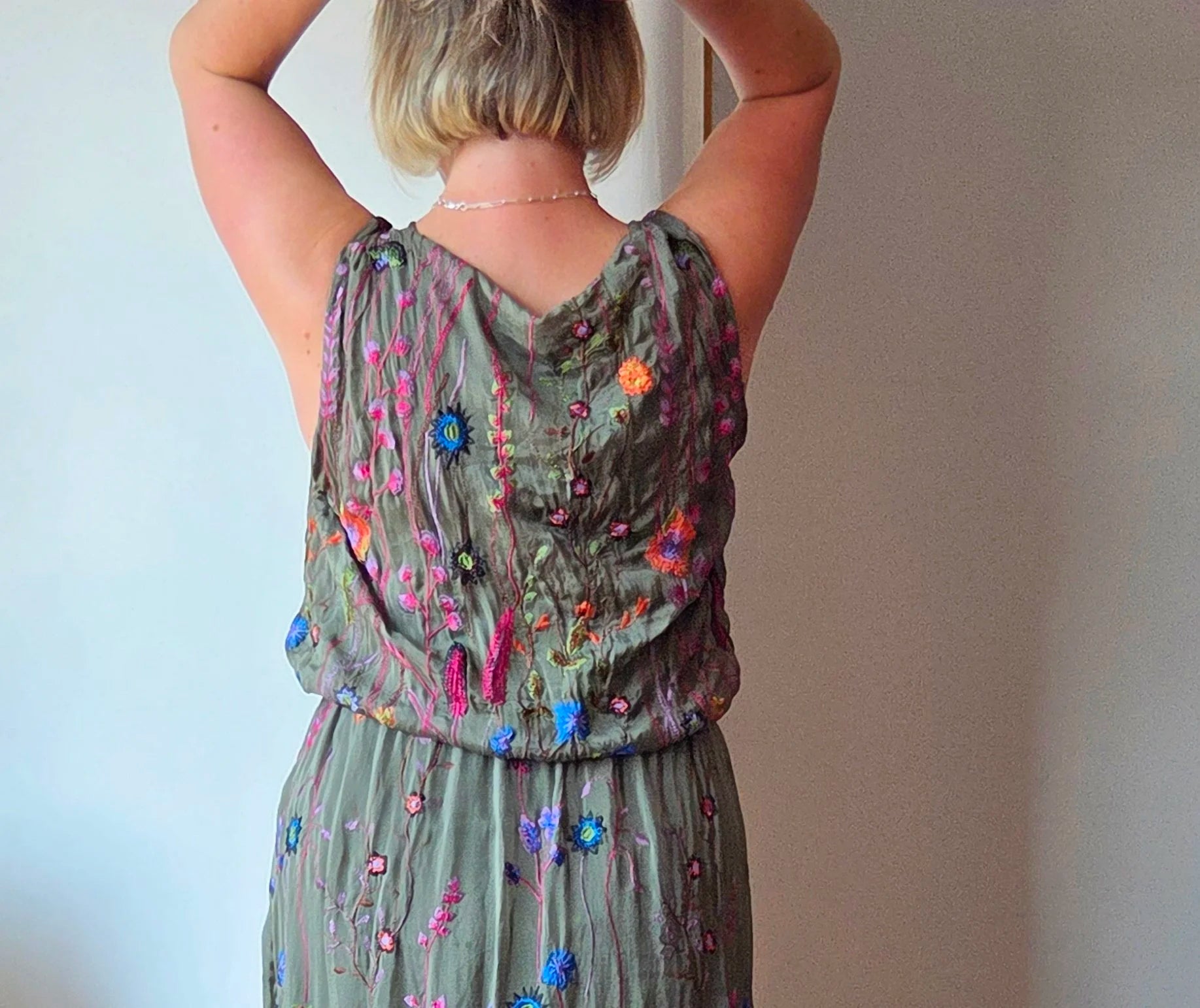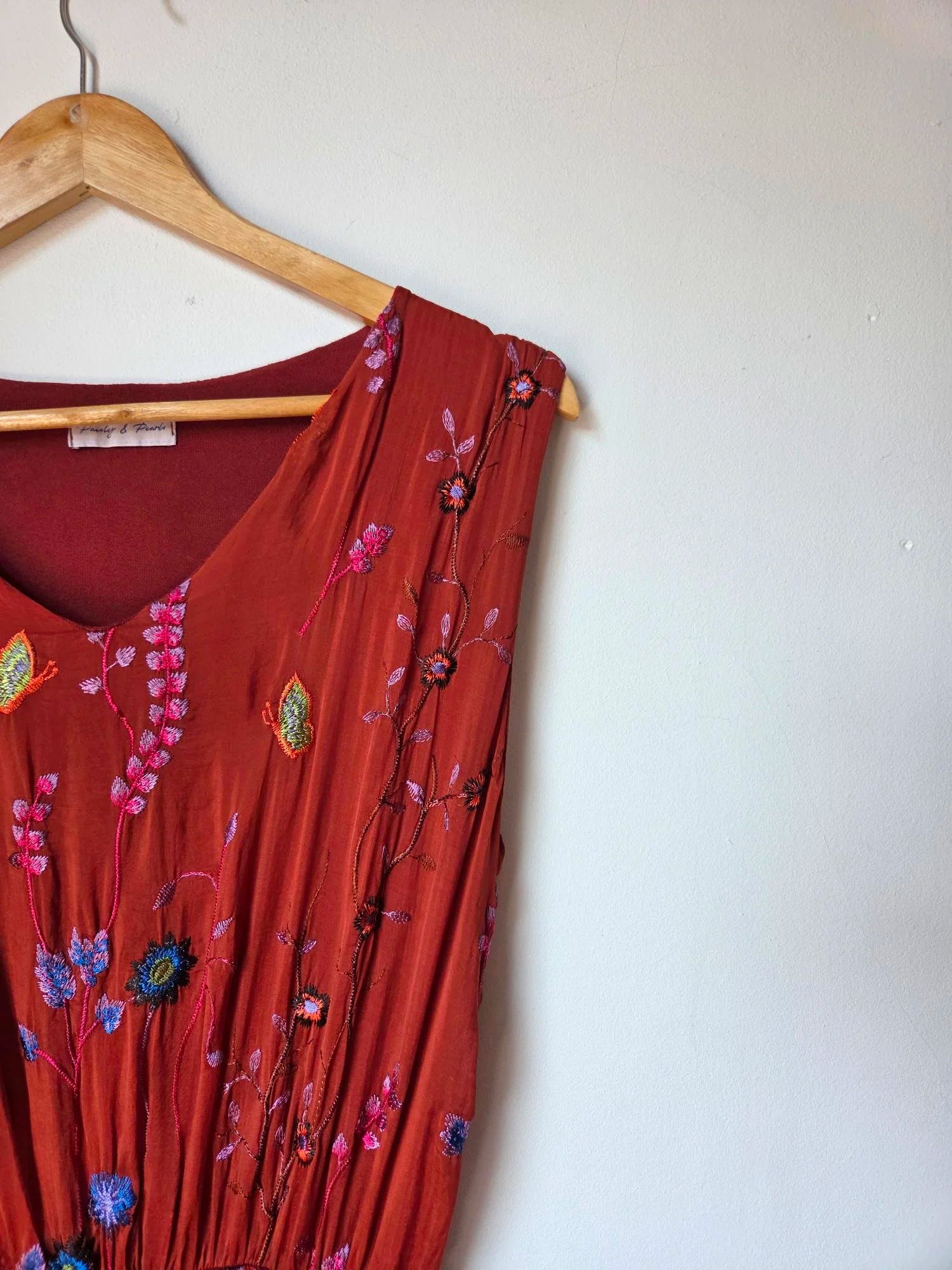 This wild flower silk blend dress features delicate embroidered wildflowers that add a touch of natural elegance. The elasticated waist detail gently cinches to hold the shape of the dress beautifully, flattering the silhouette without sacrificing comfort. Ideal for special occasions, it also pairs effortlessly with a balloon sleeve cardigan for cooler months, making it a versatile addition to your wardrobe year-round.
