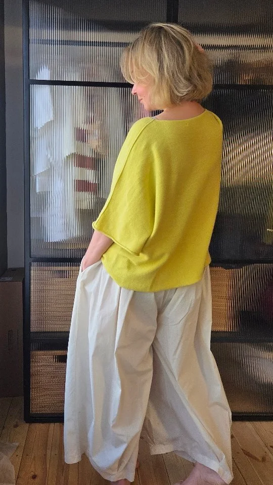 This magenta, purple and yellow knitted hat has been created using odds and ends of Merino wool accumilated from a year of orders. It is perfectly imperfect.